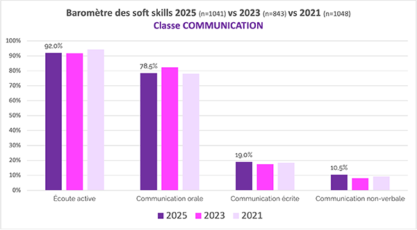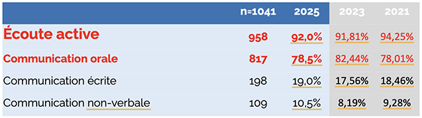 Depuis le premier baromètre en 2021, « Écoute active » et « Communication orale » ont toujours été les soft skills de communication déclarée comme les plus indispensables pour un manager.