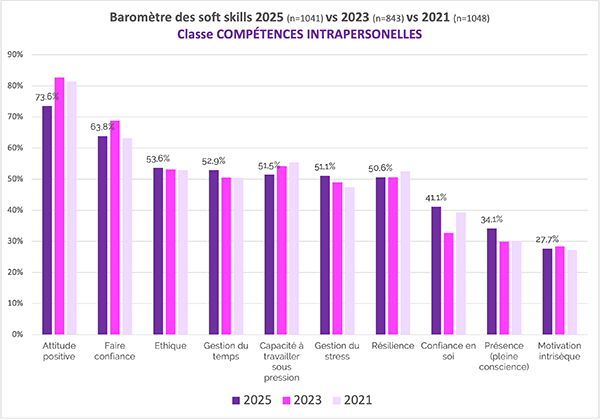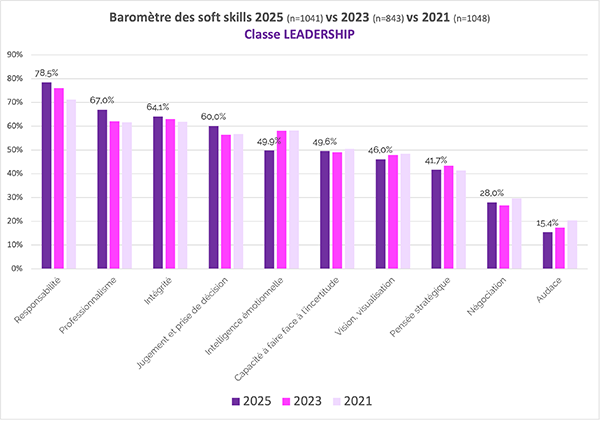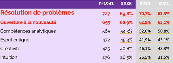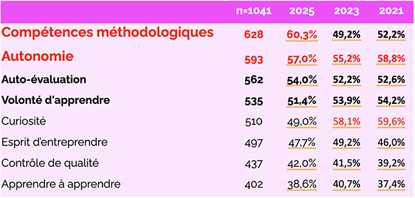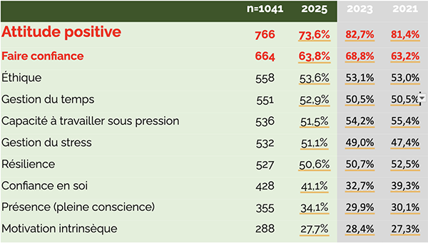 2 – Les fréquences 2025 ont été calculés à partir du nombre de réponses complètes sur les items soft skills soit 1041 au total. En 2023, il y avait eu 843 réponses complètes et 1078 en 2021.