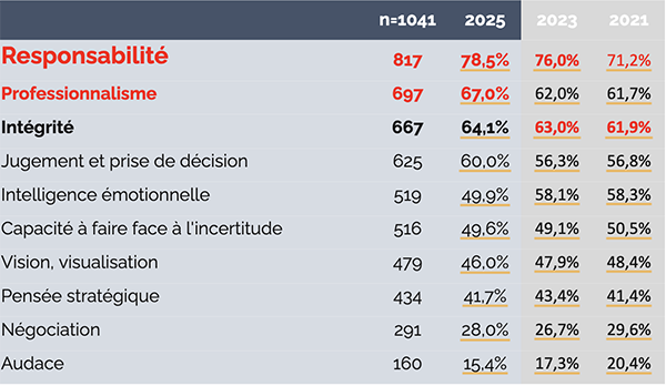 Entre les baromètres de 2021, 2023 et 2025, le trio de tête ne bouge pas avec dans l’ordre de fréquence : Responsabilité, Professionnalisme et Intégrité.