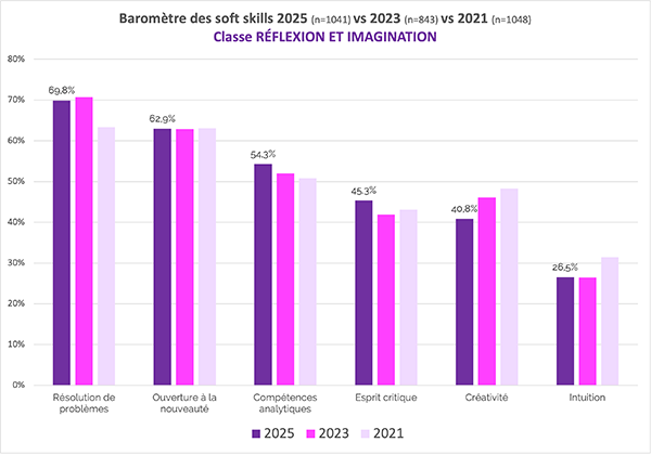 La différence entre les deux fréquences « Résolution de problème » et « Ouverture à la nouveauté » (69,8 % et 62,9 %) est statistiquement significative. Nous pouvons donc dire que la soft skills « Résolution de problème » concernant la classe « Réflexion et imagination » est significativement la plus plébiscitée. La différence entre la fréquence « Ouverture à la nouveauté » et les fréquences des quatre soft skills suivantes est statistiquement significative.